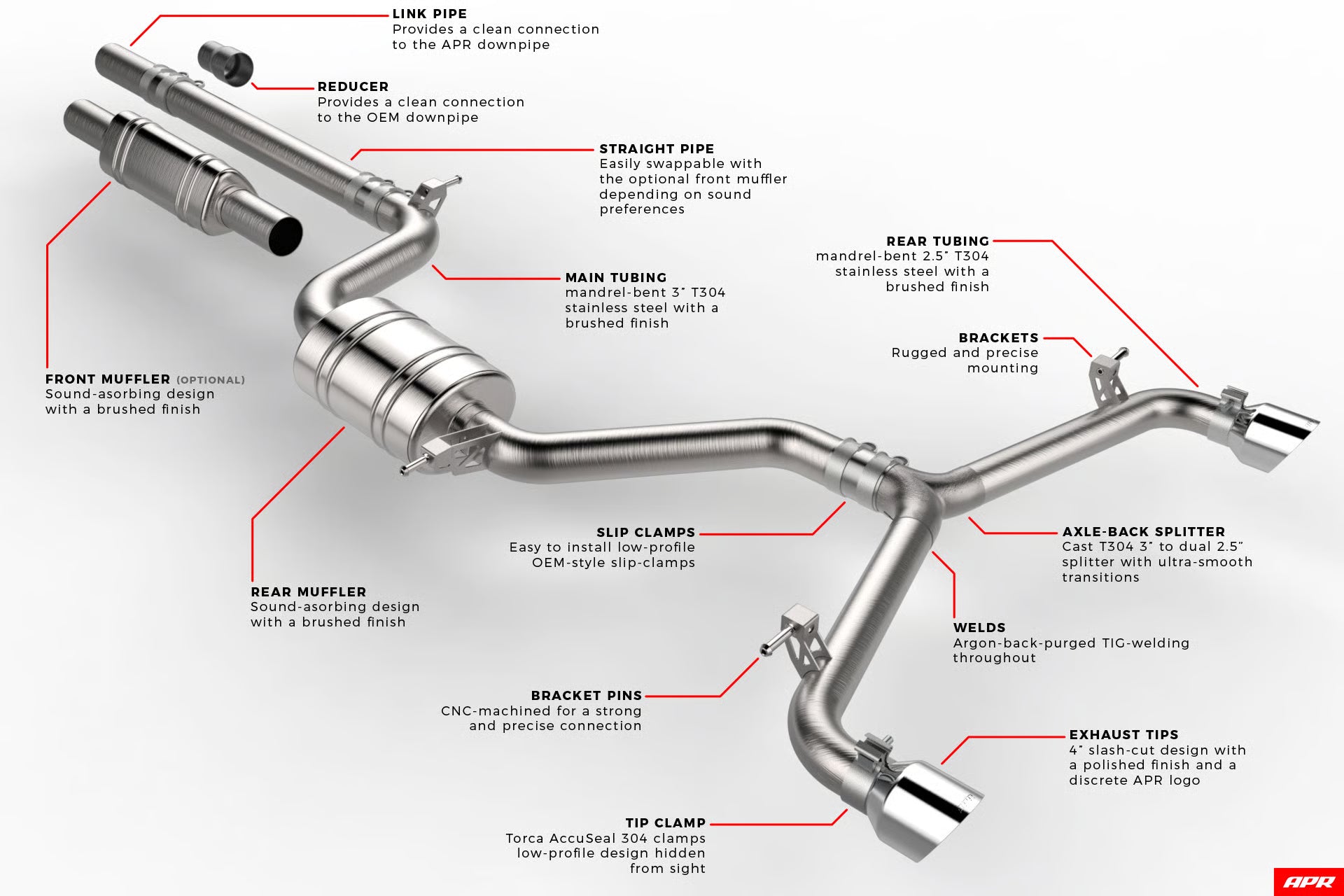 APRキャタバックエキゾーストシステムは、愛車の外観・音質・性能を独自に高める排気システムです。高品質なT304ステンレススチール製パーツを丁寧なTIG溶接で仕上げたハンドメイド製品で、ブラッシュ仕上げのストレートスルーマフラーは排気効率を妨げず、濁りやこもり音を抑えて深みのある力強いサウンドを実現します。頑丈なブラケットとOEMスタイルのクランプでしっかり固定し、取り付け・取り外しも正確かつ簡単に行えます。3インチシングルから2.5インチデュアルにスムーズに排気を分流する鋳造リアスプリッターは、リアバンパーラインに美しく収まり、4インチ径のポリッシュ仕上げスラッシュカットテールチップ(着脱可能)がスポーティな印象を添えます。低重心設計によりローダウン車にも対応し、純正部品より軽量かつ大径パイピングを採用。インハウス設計と世界基準の品質管理のもと、簡単なボルトオン取り付けが可能です。