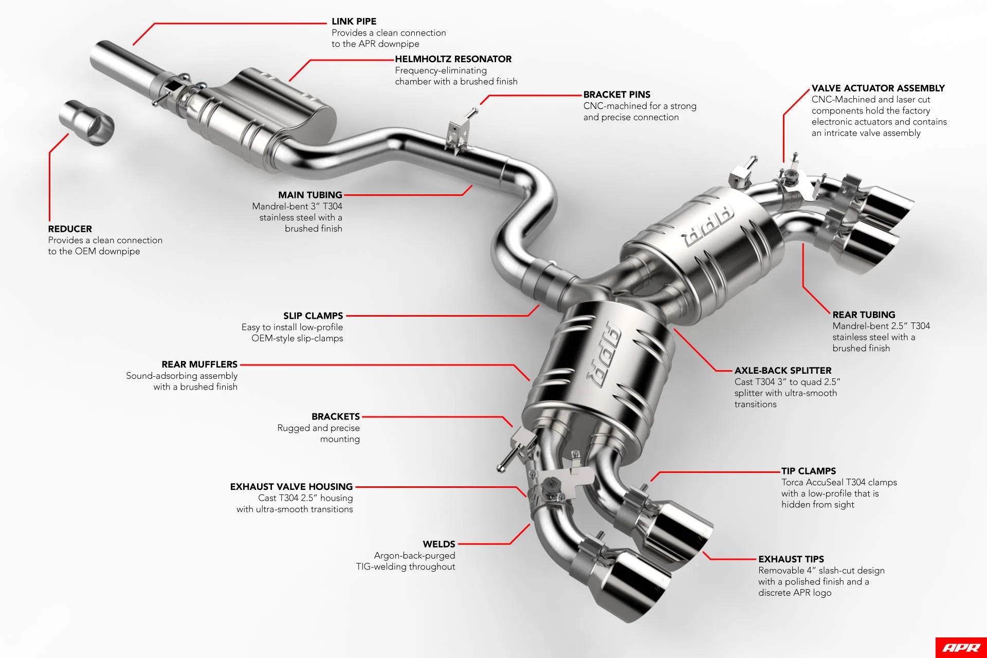 APRキャタバックエキゾーストシステムは、GOLF R(MK7.5)の外観、音質、性能を洗練させるために設計された高性能エキゾーストキットです。高品質なT304ステンレススチールを使用し、アルゴンバックパージによるTIG溶接で耐久性と美しさを両立。ブラッシュ仕上げのストレートスルーマフラーとHelmholtzレゾネーターが排気効率と深みのあるサウンドを実現します。鋳造3インチ→クアッド2.5インチスプリッターにより、排気流を滑らかに分岐し、純正電子制御バルブ対応のバルブハウジングも搭載。4インチポリッシュスラッシュカットテールチップがスポーティな仕上がりを強調し、簡単取り付け可能なダイレクトボルトオン設計で車輌の低重心も維持します。